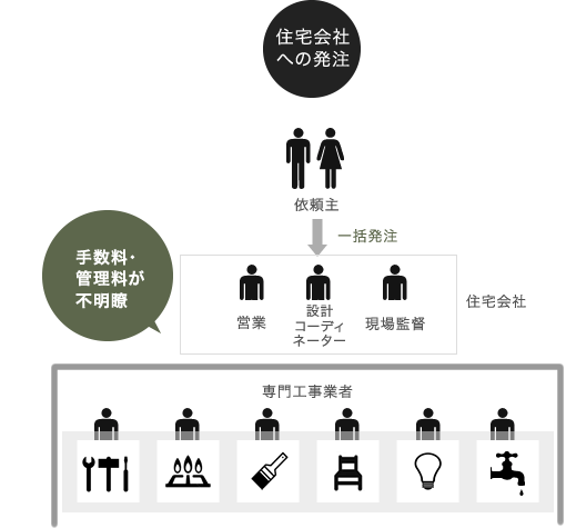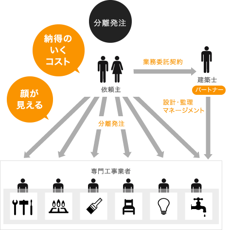 通常、工務店やハウスメーカーは施主様からの依頼を受けると、電気、水回りといった専門ごとに業者に発注し、工事全体をまとめる役割を担います。「分離発注方式」では、お施主様と各工事の専門業者が直接契約を行い、建築士が設計、工事監理、資金管理を行うため、それぞれの工事にかかる費用が把握でき、「ここは我慢しよう」とか「ここはどうしてもこだわりたい」といった小回りが利く予算配分が可能です。